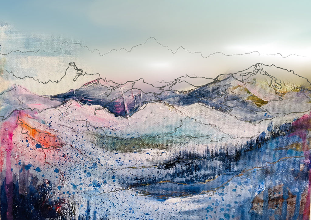 Limited edition unframed print of a panoramic mountain scene in bright colours