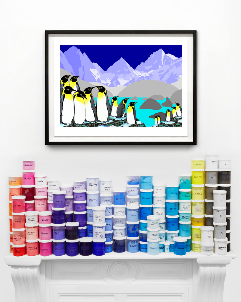This is not a traditional wildlife scene. Instead, this penguin artwork places its subjects within a stylised, contemporary landscape, where colour, shape, and composition are carefully balanced. The result feels both sophisticated and unexpected — playful in concept, yet refined in execution.