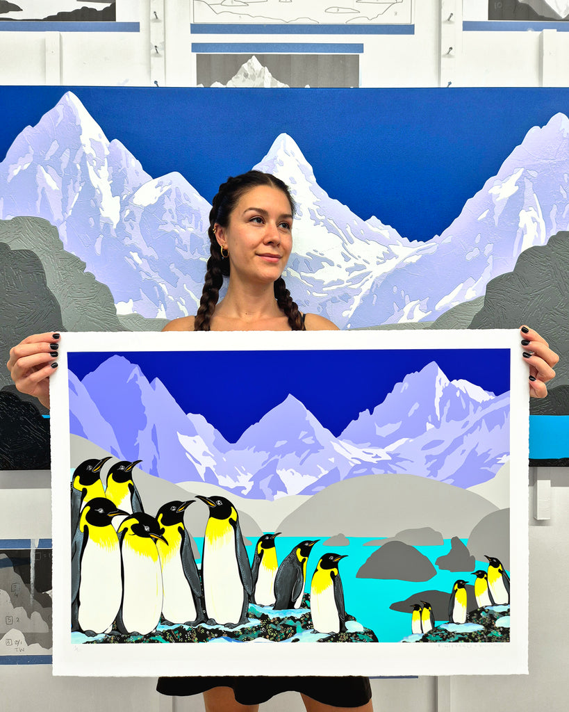 Emperor Penguins and Ottoline is a distinctive penguin artwork born from the collaboration between David Wightman and Fran Giffard. Bringing together Wightman’s bold, graphic mountain landscapes with Giffard’s characterful wildlife imagery, the piece creates a striking visual dialogue between structured alpine forms and the presence of emperor penguins.