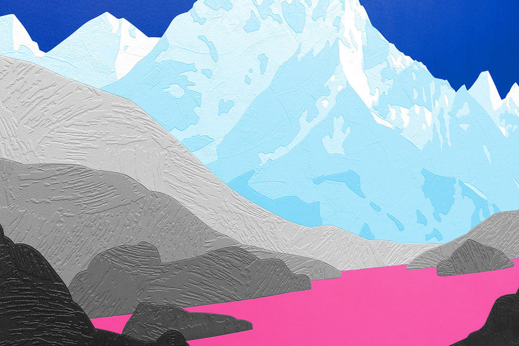 The scale of this large mountain painting allows the colour to fully unfold, creating a dramatic visual impact that anchors a room with ease. Bright blue suggests depth and distance, while vibrant pink introduces warmth and individuality, making the artwork particularly effective in contemporary chalets and architect-designed mountain homes.