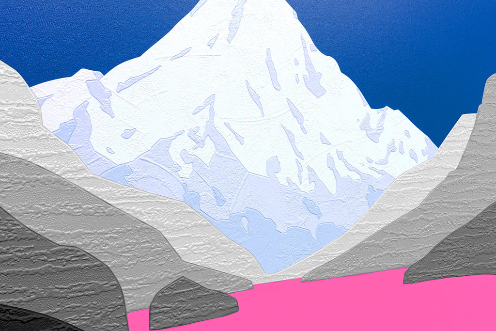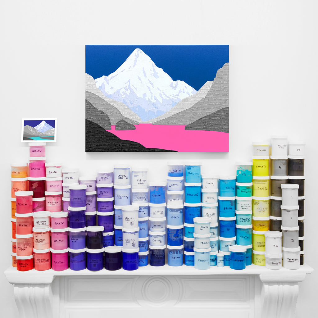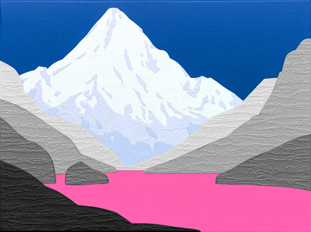 Delphine XI is an original pink landscape painting by David Wightman that brings warmth, softness, and contemporary elegance to an interior. Bright pink shapes an imagined mountain scene, creating a composition that feels both uplifting and refined. The daring palette, makes it ideal for spaces that need a colour injection.