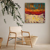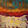 Oils, chalk, coffee and paraffin wax on a steel plate. The artist burns the artwork with a blow torch to create stunning colours and textures.